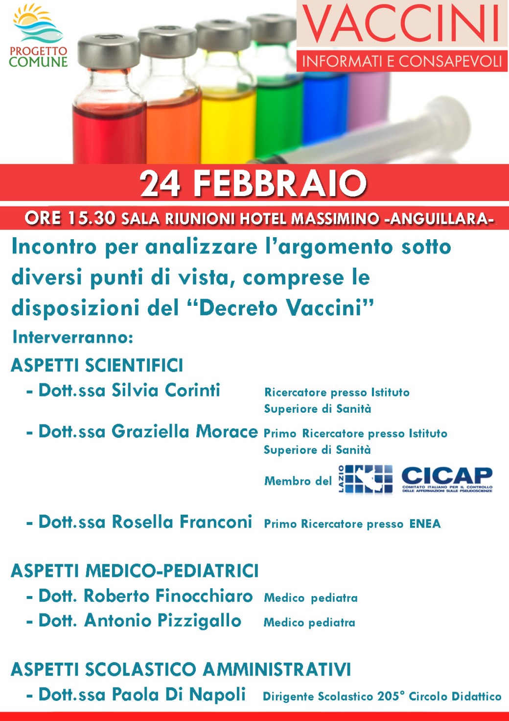 Il 24 febbraio 2018, alle ore 15.30, presso la Sala Riunioni del ristorante-hotel Massimino (Via Anguillarese, km 4,200), si svolgerà un incontro dal titolo: “Vaccini: informati e consapevoli“.